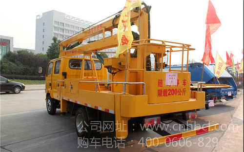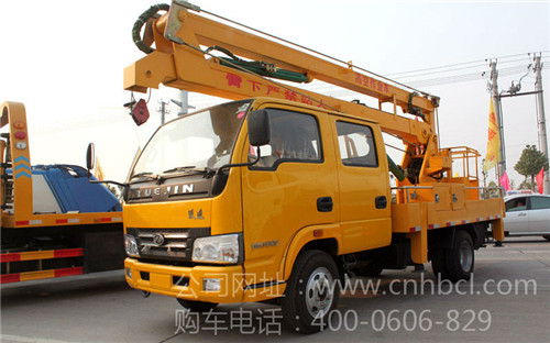 国四南京跃进高空作业车14-18米高空作业车上装配置: 采用三节折臂,带高空作业工作斗,载重量200kg。随车安装手动控制操作系统,上下可操作,工作斗中带操纵装置,360度全方位旋转,安装手油门,可在工作斗中操控升降、旋转。采用国产名牌换向阀及液压油缸,换向平衡,操作灵活方便,支腿与工作臂互锁,防止误操作过位。因作业高度18米,为安全考虑安装四个液压伸出式支腿,(16米以下为固定支腿)以保证整车在操作时的稳定性与安全性,第一节臂带前吊钩,吊钩可起重1吨货物。